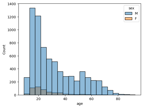 =df_sept_mod, x='age', bins=20, hue='sex') sns.histplot(data