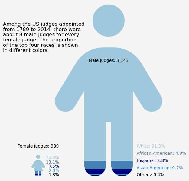 ax.set_ylim(= f"Among the US judges appointed from {judges_appointments['commission_date'].dt.year.min():.0f} to {judges_appointments['commission_date'].dt.year.max():.0f}, there were about 8 male judges for every female judge. The proportion of the top four races is shown in different colors."