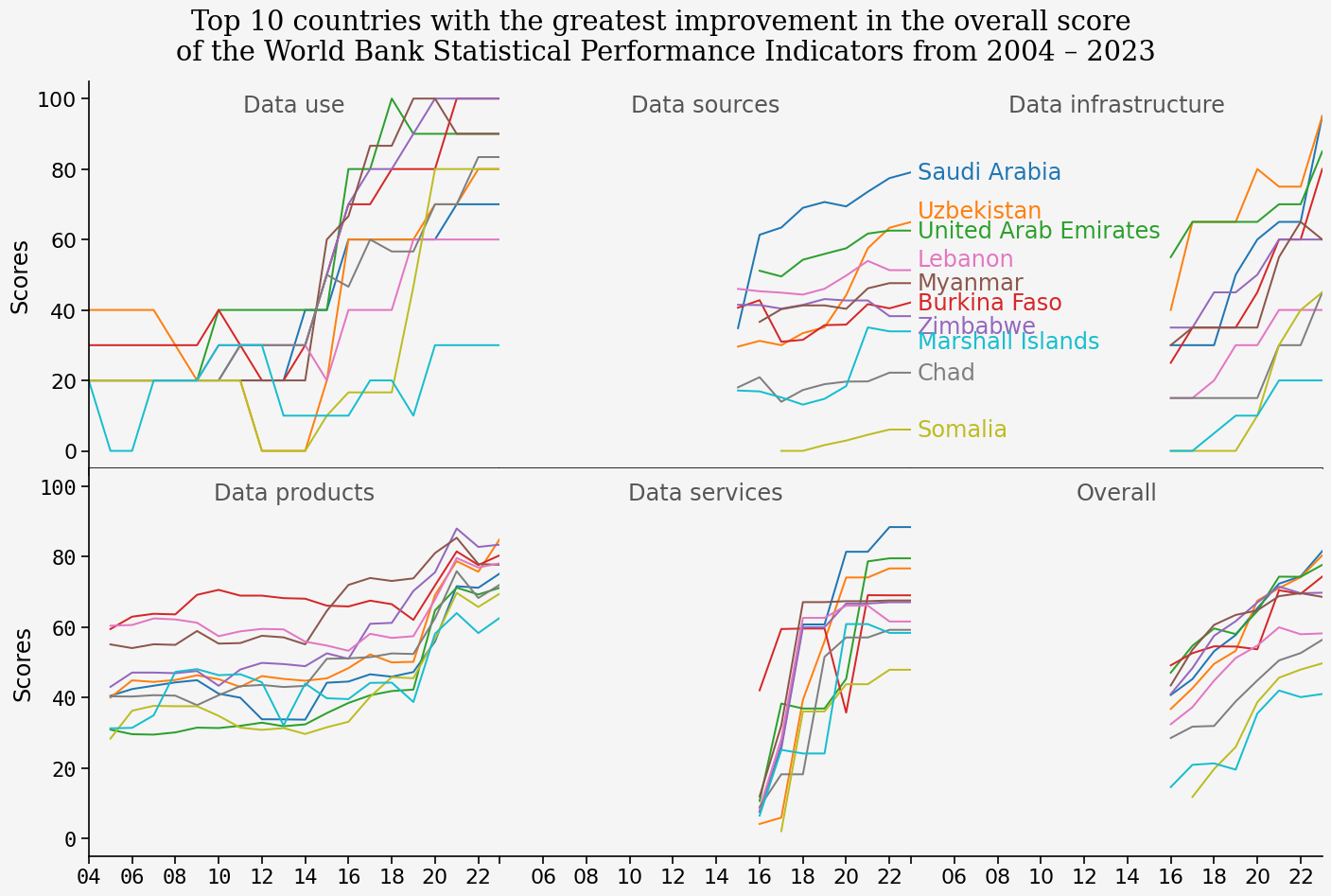 g.fig.suptitle("Top 10 countries with the greatest improvement in the overall score \nof the World Bank Statistical Performance Indicators from 2004 \u2013 2023", fontfamily='Serif', y=1.025)